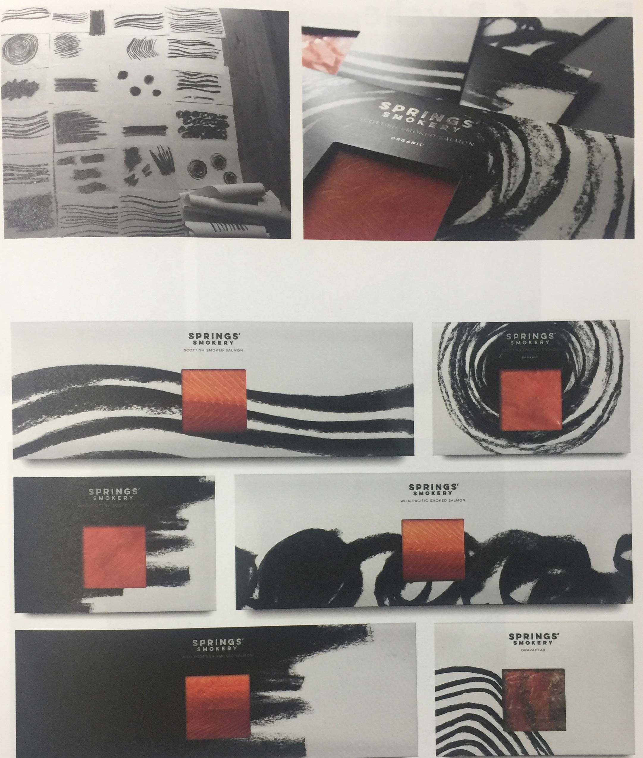 設(shè)計(jì)公司從委托方那些有著50年歷史的熏窯中取出了一些橡樹(shù)原木的炭灰,并用這些炭灰繪制出一系列帶有感情色彩的木炭畫,其中便包括南唐斯丘陵、蘇格蘭河和太平洋海浪。設(shè)計(jì)公司將包裝設(shè)計(jì)的重點(diǎn)放在委托方引以為傲的品牌故事和產(chǎn)品不含任何添加劑的特點(diǎn)上。不同種類的煙熏三文魚(yú)的種類。這套包裝對(duì)古老的煙熏傳統(tǒng)進(jìn)行了現(xiàn)代詮釋,使其具有醒目、鮮明、手工制作的特色。