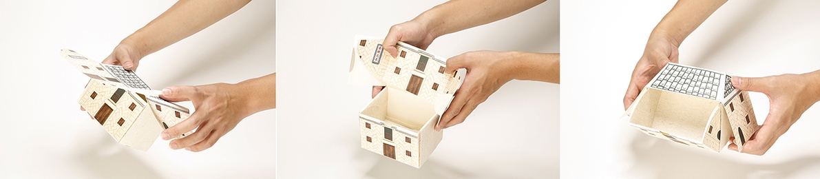 針對(duì)主產(chǎn)品金銀花茶,我們也另外設(shè)計(jì)了一棟中型的石屋包裝,一開(kāi)始消費(fèi)者拿到產(chǎn)品后會(huì)是一棟完整的屋子,開(kāi)啟前方后可將門片收于后方,成為一個(gè)抽屜小盒,當(dāng)產(chǎn)品食用完畢之后,盒子仍能繼續(xù)使用作為收納用途。