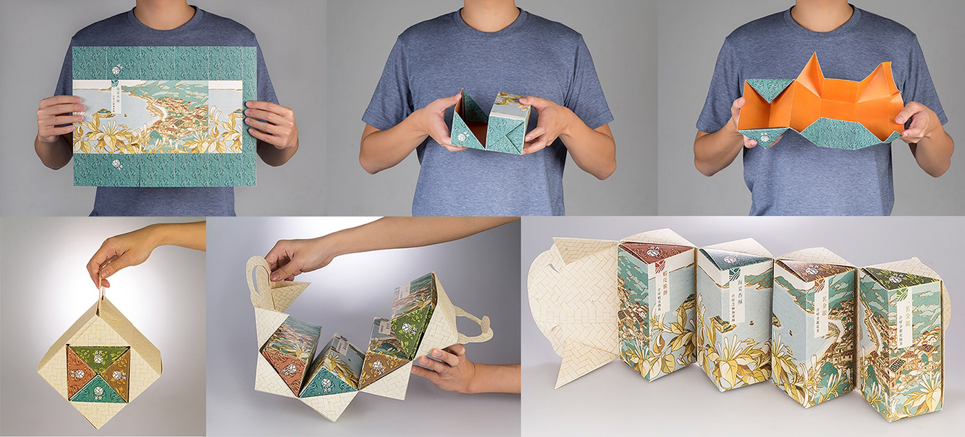 第二套包裝,為四個(gè)長(zhǎng)盒的延伸運(yùn)用。將四個(gè)長(zhǎng)盒包裝排列起來(lái)的時(shí)候,是一幅芹壁的俯視圖。