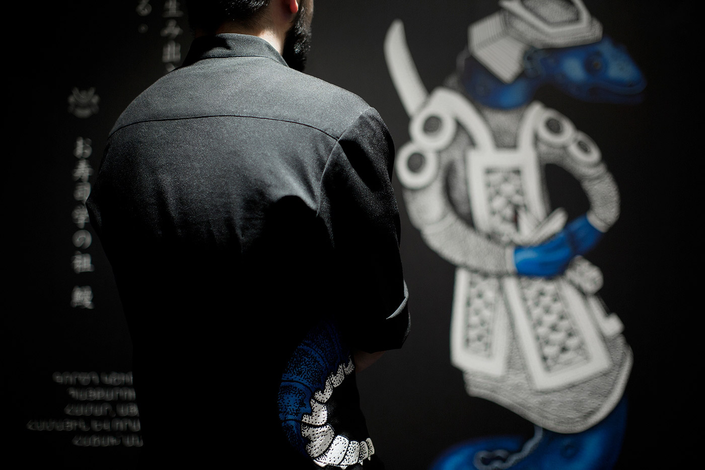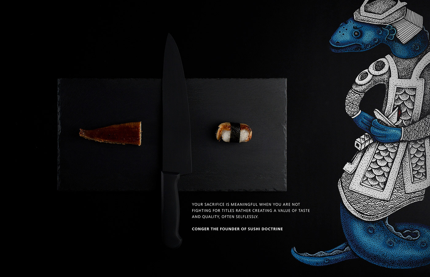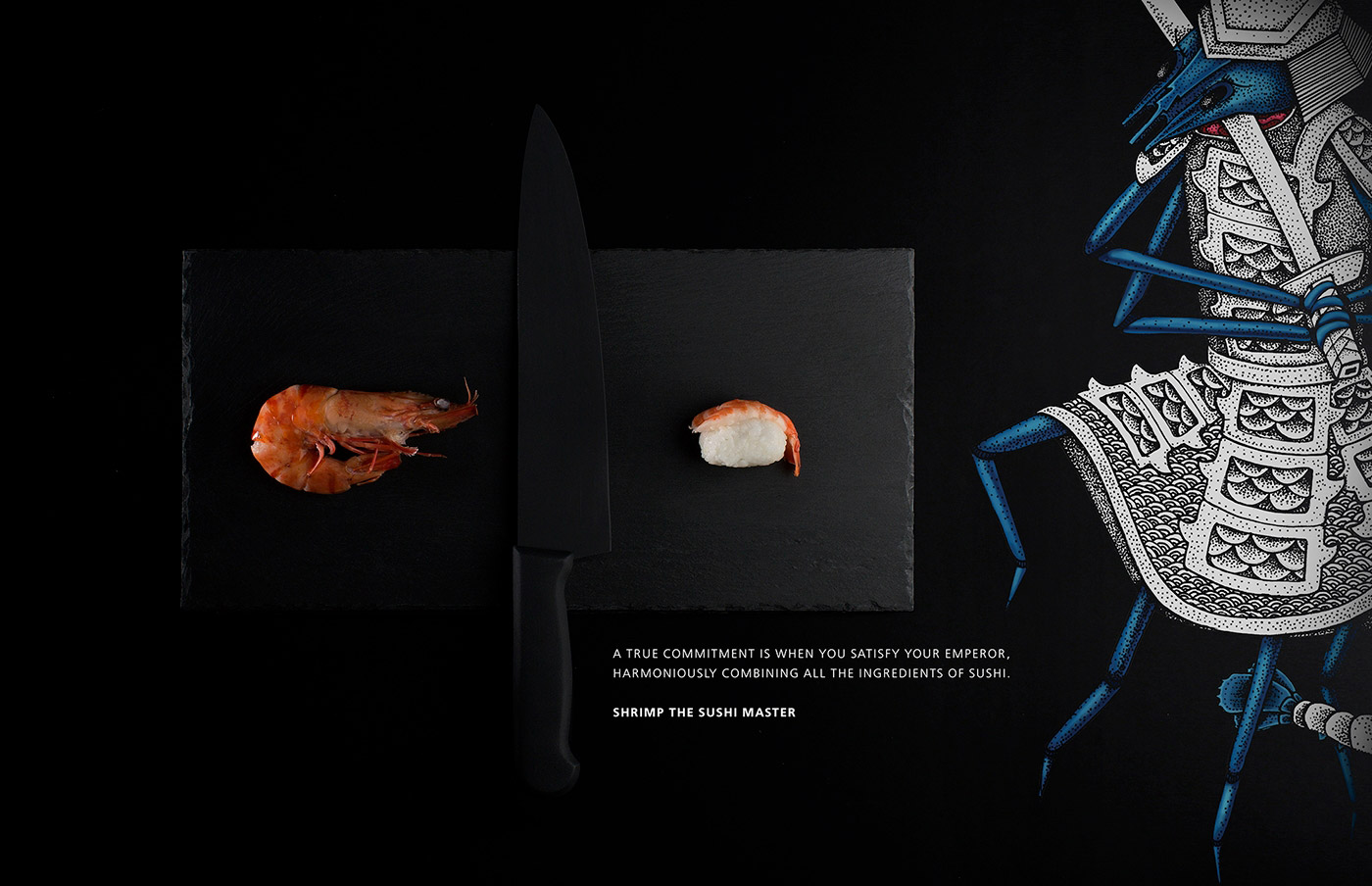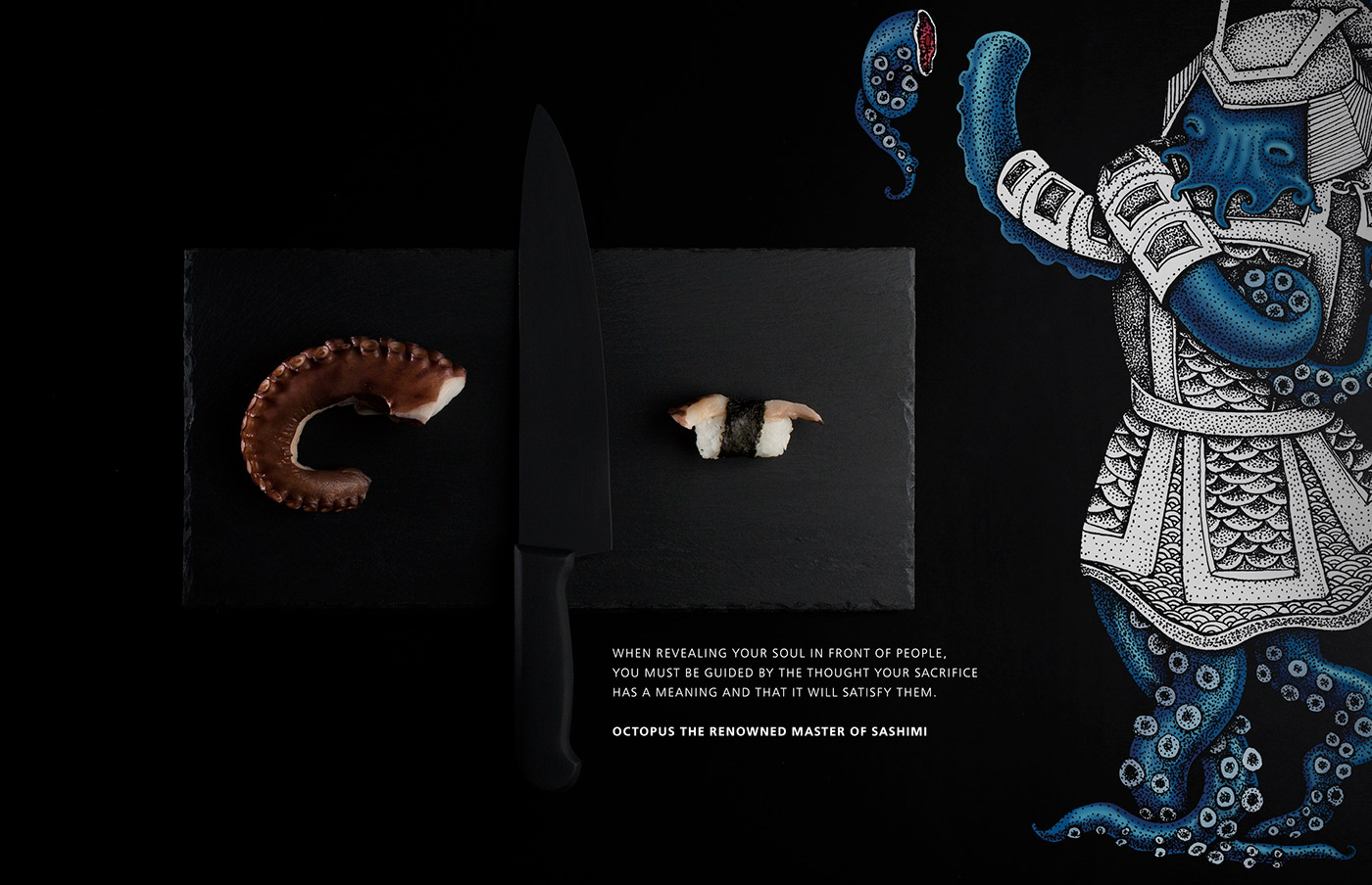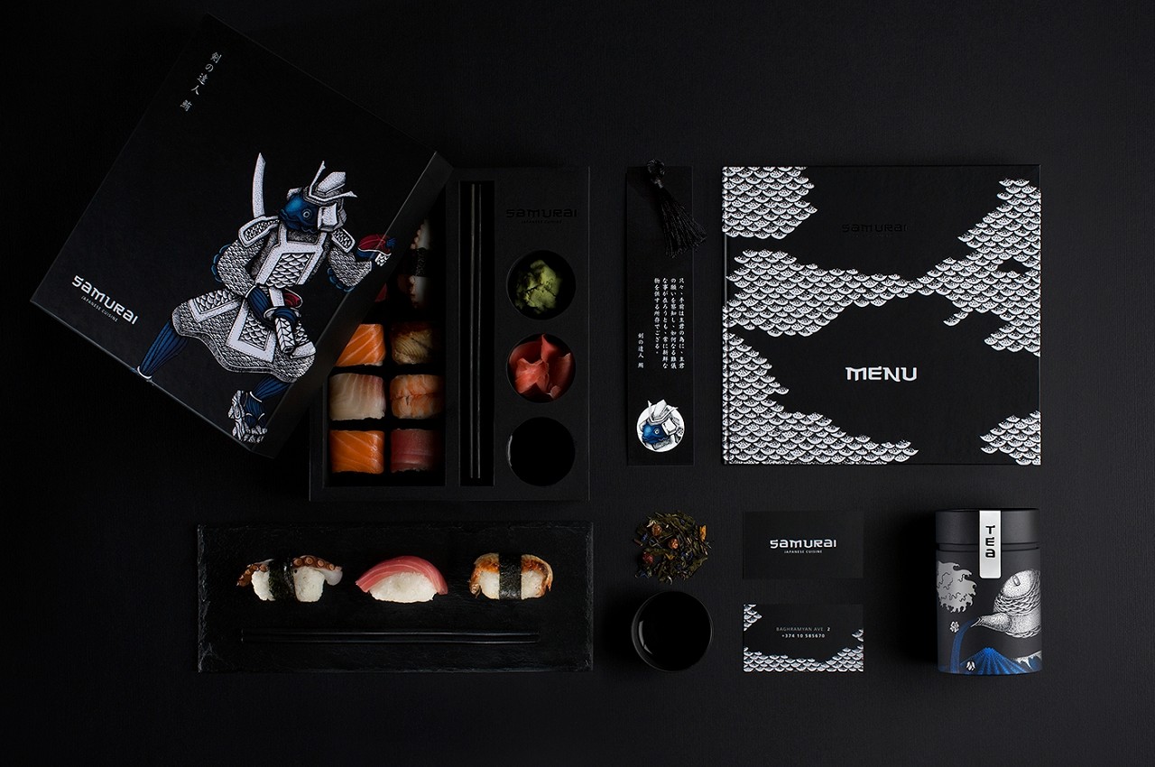 日本武士日本料理的包裝品牌形象是基于武士魚的品牌概念,準備為顧客提供最新鮮的壽司和其他日本料理美味食物。目標是創(chuàng)造一個新的品牌形象,吸引新顧客,尤其是年輕人將成為意見領(lǐng)袖。團隊提出了一種“武士魚”的理念,即讓“大腹”來滿足他們的皇帝,即他們的顧客。這種不尋常的日本習俗和日本料理的特點啟發(fā)了設(shè)計師們創(chuàng)造出四種“自我犧牲的魚”:金槍魚、蝦、章魚和康格。