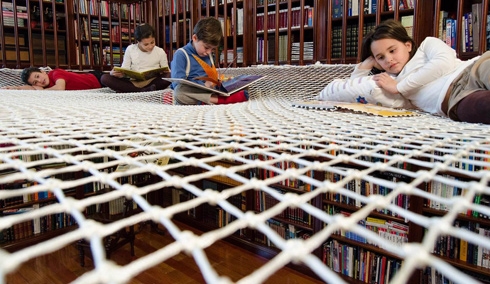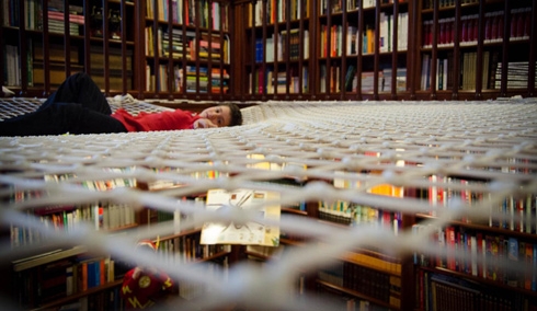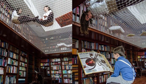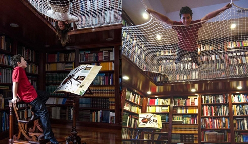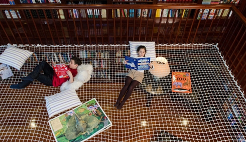 摘要:這是西班牙的一個(gè)書店設(shè)計(jì)。在樓梯間周圍鋪上一張大網(wǎng),給想在這里休息閱讀的人留了一些自由舒適的空間。人們可以在這里聊天,休息,看書,玩耍。網(wǎng)的四周還留了一些孔洞,可以讓上下的人交流。小孩子喜歡從這個(gè)孔洞...